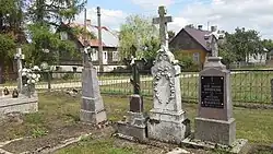 The building is situated on St. Barbara Street, within a plot surrounded by a low, modern fence. Nearby the church are several tombstones and a few scattered trees.