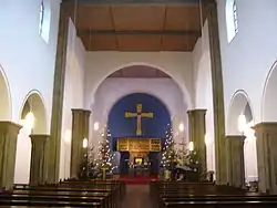 St. Bernward's Church houses several sightworthy pieces of art. The Gothic retable showing various saints and the Coronation of the Virgin dates from 1430.[5] It originally stood in Trinitatishospital, a hospital which was founded in 1230 and destroyed in 1945. There is also a remarkable statue representing Saint Bernward holding a Bernward Cross in his hand. The golden Bernward Cross which was made about 1130 is one of the most famous items in the museum of the Cathedral of Hildesheim.