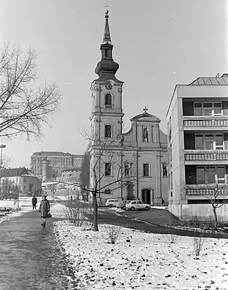 The reconstruction was begun by József Dankó the Elder in 1812 and it was finished by Ludwick Kimnach in 1818.[10] Due to a shortage of funds, the ornate spire of the tower was replaced with a symple pyramidal roof in 1823. The interior and the new furniture was not finished until the 1830s. A new parish house was also built in 1818-19.