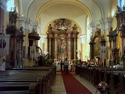 Between 1728 and 1736 the church was enlarged by Christian Obergruber, a master builder originally from Carinthia. A Baroque nave was added to the older part that was retained as the chancel. The main pieces of furnishings, including the pulpit and the altarpiece, were constructed in the 1740s. A crypt was built under the whole nave in 1749.[8] The slow pace of the construction shows that the financial resources of the parish were limited, although several citizens had left donations for the church.