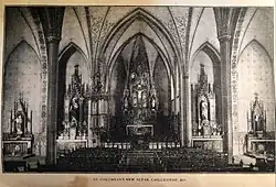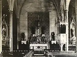 In 1892 the present rectory was built as a Franciscan monastery with 30 rooms plus a spacious attic. The previous rectory was located directly to the east of the church and needed to be moved to make way for an expansion of the church building. The parish then numbered about 100 families, fairly evenly divided between farmers, railroad people, and other business people. In 1894 the church was expanded, adding an apse and two transepts containing large stained-glass windows made by George A. Misch and Brothers of Chicago. The south window depicts the three patrons of the Franciscan order: Saint Clare of Assisi, St. Louis IX, King of France, and Saint Elizabeth.[3] The north window shows the Holy Family of Jesus, Mary, and Joseph. The four stained-glass windows in the apse depict Saint Francis receiving the stigmata, the Annunciation, the child Jesus appearing to Saint Anthony, and St. Margaret Mary Alacoque receiving the devotion to the Sacred Heart. Much of the statuary dates back to the late 19th century and was manufactured in Munich, Germany.[4]: 55
