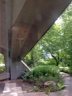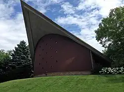Designed by architect William P. Wenzler and completed in 1957,[13] the building on Watertown Plank Road in Elm Grove included one of the first hyperbolic paraboloid roofs in the United States.[14] The roof was made of poured concrete and extended 45 feet beyond the altar, which was hung with a crucifix created in an abstract style and lit through natural light.