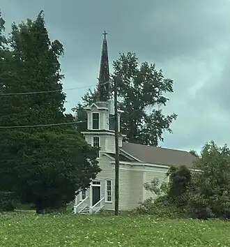 In 1896, as the Lewiston congregants outnumbered the Woodville congregants, the church was pulled by mule team three quarters of a mile to Lewiston, although the original cemetery remained in use.[1] The church was moved again in 1966 to be set back farther from the street. By the time of its nomination to the National Register, there were nine congregants remaining, with services held once a month.[1] By the early 1990s, the congregation had diminished to a single member, Elizabeth Steinhardt-Widmer. Historic Woodville, Inc., a local preservation trust formed in 1998, took on the church as its first restoration project. The church was moved back to its original Woodville site in 2000.[4] Bruce Lassiter, a local restoration contractor, commenced work soon thereafter, completing the restoration in 2004.[4]