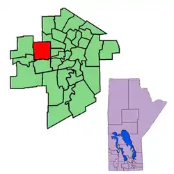 The modern St. James riding was created by redistribution in 1957 out of part of Assiniboia, and has formally existed since the provincial election of 1958. The riding is located in the western section of Winnipeg.