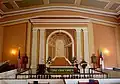 Inside, St. James Church is dominated by Potts' trompe-l'oeil frescoes, which cover all four walls beginning at the dado and rising to and covering the barrel vaulted ceiling. The walls are painted to simulate recessed panels which rise to a painted cornice. Potts then painted a row of coffers around the four sides of the ceiling which frame a large panel that is decorated with simulated plaster scrollwork. In the center of the ceiling is a painted medallion with a profusion of scrollwork. Apart from the ceiling, Potts lavished much detail on the wall behind the chancel, where four fluted pilasters rise to support an entablature and cornice, creating a visual opening to a barrel vaulted apse with coffered ceiling, all painted onto the flat wall. The frescoes conceal a door which opens into the vestry that is centered on the rear wall of the church. In the 20th century, Linda Croison and Philip Ward restored the frescoes, but preserved patches of Potts' original work in the back of the nave.