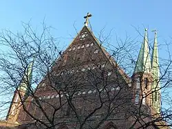 The church building is a particularly clear example of the Brick gothic style. All three naves were covered by a single especially large pitched roof. The west gable's extraordinary form and size derives from this design. It is divided into three stories, which each contain pointed arch windows arranged in pairs. The base line of these windows is a line of ornamental brickwork. At the apex of the gable is a cruciform window with a star of David. This has been in place since 1878, when the roof was repaired and the new gable installed, surmounted by a stone cross. The star of David was probably included as a result of horror vacui. No other symbolic significance at all is attested in church documents. One can, however, suggest that the star of David is symbolic of the Old Testament and the cruciform shape is symbolic of the New Testament. The two belong together and form the foundation of the church.