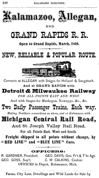 Advertisement for Kalamazoo, Allegan & Grand Rapids, with whom the St. Joseph Valley connected in Kalamazoo. By the end of 1869 both systems were leased by the Lake Shore & Michigan Southern.