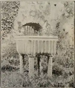 Canon William Carrigan adds to this in 1905, stating that this baptismal font was moved to St. Francis' Abbey in "about 1889".[16] This move from Mr. Ayres' property to "near the east window of St. Francis'"[17] is attested in the Kilkenny Moderator of July 27th 1889, where it is presumed that the font had been originally at St. Francis' Friary. This is given as the reason why it was moved (back) there.[17] This article suspects that Alice Kyteler committed the theft of the baptismal font herself "for its subsequent use in her nefarious practice."[17] It describes the font as being of "black marble" (i.e. the Kilkenny limestone referred to as "Kilkenny Marble") and weighing 11 cwt. The size is described as 31 inches square on top, diameter of the basin 21.5 inches and of 2.5 inches depth, with the external depth being 19 inches. The pillars, also visible in the photographs have a diameter of four inches and length of 14.5 in. The decoration has "carved in low relief the vine-leaf trefoil".[17]