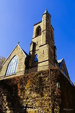 This church was designed by Richard Upjohn and was officially consecrated on October 25, 1869. The church is a late work of Upton's, and represents a relatively pure version of the Gothic Revival, well removed from the stylistic elements of the Greek Revival that he began his career with.[3] It is a stone structure, built primarily out of local gray stone, with red stone as trim. It is set partly on natural terrace in a steeply sloping hillside, which has been extended and supported by a stone retaining wall. The church has a cruciform plan, with a square tower rising at the northeast corner. The outer corner of tower is extended by an octagonal stair turret, which rises a short way beyond the crenellated tower top to its own conical roof. The interior is tiered with the entrance and a small chapel at the lowest level, an intermediate level which houses Sunday School rooms and the church office, and then the main sanctuary on the third floor. The interior is lavishly appointed, with English Minton tile, Black Walnut, and stained glass windows by Louis Comfort Tiffany and Charles Gibson. There are also several commissioned works of fine art, including brass work by J.R. Lamb, a 24 karat gold illumination, and several hand carved pieces.[3]