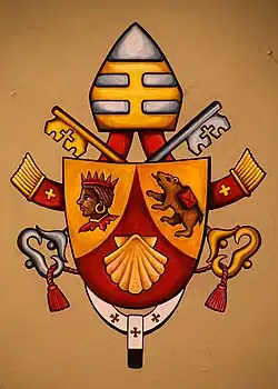 Two noted historically recent popes are also commemorated, featuring their stenciled coat of arms on the ornate painted ceiling of Old St. Mary's. Pope John Paul II has his blue-and-gold coat of arms over the church crossing (featuring the old papal tiara, or three-tiered crown), while Pope Benedict XVI (formerly Joseph Cardinal Ratzinger), has his papal coat-of-arms displayed over the choir loft featuring the more-updated mitre in place of the tiara. (As the first German-background church in the Archdiocese, it was as of 2015 the only parish with Pope Benedict XVI's coat-of-arms on public display in the fabric of the church building).