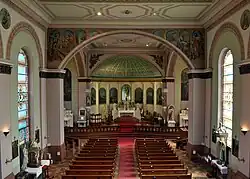 In 1872, five women came to St. Louis from Germany, under the leadership of Mother Mary Odilia Berger, having been unable to live out their lives of religious dedication and service due to the policies of the German government known as the Kulturkampf. They found lodging in an attic in the church complex, having the same door to their residence as to the church. They organized themselves in 1874 as a religious congregation under the name of the Franciscan Sisters of St. Mary, taking their name from the church.[3] The healing and therapeutic ministry of their Order continues in today's SSM HEALTH CARE SYSTEMS, a St. Louis-based hospital/nursing organization which operates hospitals and medical care facilities throughout the Midwest and the Mid-South. A bronze plaque mounted on the back wall to the left of the entrance honors the American foundation of the Sisters of St. Mary.