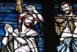 The Annunciation – The angel of God announces to the Virgin Mary that she is to be the mother of Jesus, the Messiah. The symbols in the window relate to Mary. The circle at the top is the "fleur-de-lis," symbol of the Virgin Mary. -