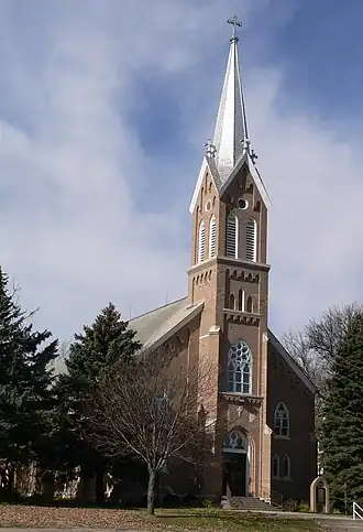 The new church was designed in the Gothic Revival style by another Franciscan, Br, Leonard Dorschied, O.F.M. Construction began in 1900 and was completed in 1901.[2] The cost of $17,000 had been held down by the contribution of unskilled labor by parishioners, as well as through the use of brick and lumber from the 1898 Trans-Mississippi Exposition in Omaha, delivered by train.[4][3] Limestone for the foundation was transported from a quarry near Florence, Kansas, and sand was brought in from the Loup River, 20 miles to the south.