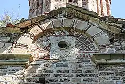 The monastery church consists of two structures. The older original building is a single-nave church with a triconch apse and a semicircular vault. The western part is a compact inscribed cross made of stone and brick, and its facades are adorned with pilasters and blind arcades. This church has a slender octagonal dome and currently serves as a narthex. Above the entrance of the church, there is a large fresco depicting St. Nicholas, the patron saint of the church. High on the central section of the narthex, framed by an arch, there is an oculus, surrounded by a rectangular plaque executed in low-relief.[5] The oculus is outlined by a cable motif. The plaque, which encompasses vegetal and zoomorphic imagery, is dominated by a twin-figured crowned lion King.[6]