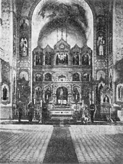 The church floor was tiled with terracotta. Inside, there was a three-tiered iconostasis made of gilded wood.[8] Preserved photographs indicate that images of saints were also placed in side decorative icon cases, and the building's walls were covered with polychrome.[12]
