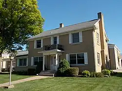 By the middle of the 20th-century, the congregation outgrew its facilities yet again. This time the congregation chose to relocate further north and acquired property across Lombard Street from Vander Veer Park,[6] and across Brady Street from the Outing Club. On the property was the E.C. Mueller House at 2136 Brady Street. The Georgian Revival home was designed by the Davenport architectural firm of Temple and Burrows.[7] It was incorporated into the new church complex and housed administrative offices. It and another small house along Lombard Street are contributing properties in the Vander Veer Park Historic District. In 1952 a new sanctuary was built in the Georgian Revival style on the corner of Lombard and Brady Street. It contains 5,500 square feet (510 m2) of space.[8]