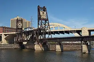 ![]() The St. Paul Union Pacific Vertical-lift Rail Bridge with the Robert Street Bridge in the background | |