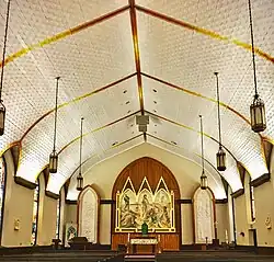 A prominent feature of the church interior was a triptych by American painter Ben Long, a three-part fresco depicting Christ’s Agony in the Garden, Resurrection, and Pentecost. The fresco was severely damaged in February 2002 and cannot be fully restored.[3] Following the damage to the fresco, the interior of the Church was renovated in 2007.