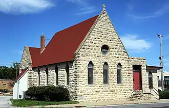 It is a small, one-story, Gothic Revival style limestone building. It has a high gable on the primary facade, a clerestoried chancel with projecting polygonal apse, and locally crafted windows of colored cathedral glass.[2]: 2