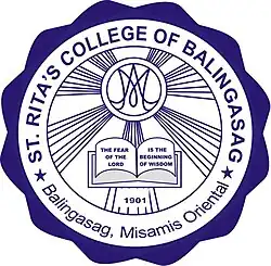 St. Rita's College of Balingasag is a Filipino, Catholic, co-educational RVM institution founded in 1901 by a Jesuit Missionary, Rev. Fr. Gregorio Parache, S.J., the parish priest as a parochial school aimed at giving basic education to the children of the parish. Four RVM Sisters: Ma. Marciana de Leon, RVM, Ma. Dominga de Jesus, RVM, Ma. Andrea Alba, RVM and Ma. Maura Lopez, RVM sent by Rev. M. Ma. Efigenia Alvarez, RVM, the Superior General of the Congregation, were among the first teachers.[1]