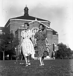 Tennis players at St. Roch Playground with Our Lady Star of the Sea Church in the background, 1936