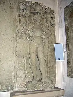 Especially in the choir there are a number of funerary monuments and tombstones from the 15th and 16th centuries. They commemorate clergymen and members of the local nobility who were buried in the church at that time. The grave monument of Johann Renhard von Gärtringen, called Harder, who died in 1519, is of outstanding craftsmanship and, apart from a few insignificant missing parts, well preserved. It shows a knight in full armor standing on a reclining lion. Above the knight hover two putti holding a visored helmet over his head. In comparison with contemporaneous funerary monuments, this one has some peculiarities, for example, the motif of the hovering putti with helmet is iconographically unusual. The identity of the sculptor is unknown.[14]