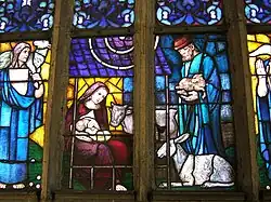 The stained glass windows from 1913 and 1965 are from the stained glass workshop of Valentin Saile in Stuttgart. The eight Art Nouveau panes from 1913, designed by the painter Eduard Pfennig (1878-1952, brother of the architect Oscar Pfennig) were originally distributed among the three closing windows of the choir. Today they are grouped in the lower two rows of the axial window and are covered by the organ. Two panes in the lower row thematize the birth of Christ, one shows Christ as the Good Shepherd, and one shows the Risen Christ. The row above contains four ornamentally designed panes. In 1965, the three choir polygon windows, the middle one above the Art Nouveau panes, received new glazing in which the stained glass fills the entire window.[11] They were created by Adolf Valentin Saile and depict the following biblical scenes: (left from top) six prophets, Adoration of the Magi and Shepherds, Fall of Man; (center from top) Heavenly Jerusalem, Lamb, Stream of Living Water, Angels escorting the redeemed peoples to Heavenly Jerusalem - below the Art Nouveau discs; (right from top) Women at the Empty Tomb, Good Shepherd, Pentecost, Martyr Stephen and Apostle Paul.