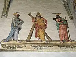 In the chancel is a circa 1660 Apostles' Creed cycle that begins on the south wall with three apostles and continues on the north wall with six more. The last three apostles on the north wall were washed away in favor of the late medieval sacrament house carpet over which they were painted. The order of the apostles, and thus the assignment of the twelve articles of the Apostles' Creed, corresponds to the common practice of combining apostles and creedal articles in a largely arbitrary manner.[9] Between the two windows of the south wall of the choir is Apostle Paul, somewhat isolated from this cycle. The text attached to him in place of an article of creed begins with a quotation from Pauline epistles (2 Cor 11:5 EU), which underscores his ambivalent affiliation with the other apostles. The images of the apostles on the walls of the choir are complemented by one image each of Christ and John the Baptist, who is located in the northwest corner of the choir in close proximity to his namesake, John the apostle, who belongs to the cycle. In the corners of the choir polygon there were originally probably three representations of archangels, of which only Rafael is preserved.[8]