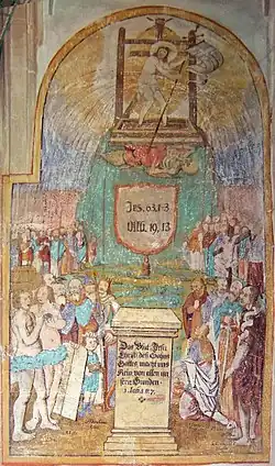 The paintings in the Gärtringer church are mainly from the 16th and 17th centuries. All late medieval murals were only uncovered again in the 20th century. During the restorations in 1913 and 1965, the faintly recognizable parts were repainted, which partially distorted the character of the paintings.[8]