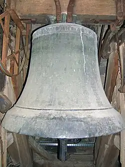 It is assumed that the church received a new belfry in 1527, in any case, this date is carved on one of the struts and the construction of the chair corresponds to late Gothic style. Another bell probably made the new chair necessary, it is certain that the chair carried three bells at that time. The large, still existing bell Dominica from 1456 can be attributed to the Reutlingen foundry of Hans Eger, especially because in the Herrenberg collegiate church with the noon bell hangs a bell cast by Eger, only slightly younger, which is almost a copy of the Dominica.[18] The bell is a copy of the Dominica. In 1527 there was still a small c2 bell on the tower, which did not have any inscription and ornamentation, which suggests a great age; it was probably cast in the 13th or 14th century. In January 1901 this bell cracked and since welding was not possible at that time, it was melted down together with another small bell and recast. Relatively little is known about the third bell. According to the dimensions of the southern separator, this one was only slightly smaller than the largest one, the diameter is estimated at 100 to 110 centimeters, the weight at 600 to 900 kilograms. Sometime between 1761 and 1828 this bell must have been taken down, the reason for this is not known.[18]