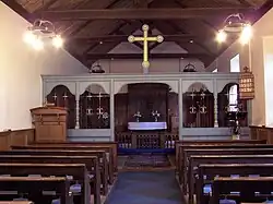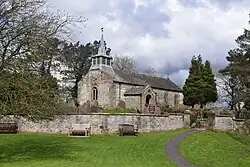 The church is built in limestone, rendered on the north side, and has a stone flag roof. It consists of a continuous nave and chancel, and a south porch. At the west end is a square timber belfry with louvred openings, surmounted by a lead broach spire and a weathervane in the form of a fish. The porch is gabled, and has a round-arched opening, above which is a carving in high relief. Inside, there is a plain 12th-century font, a 17th-century communion table, a communion rail dating from about 1700, and a west screen incorporating a rail dating from 1682.[1][4]