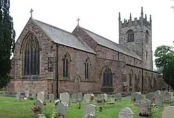 The church is built of sandstone, yellowish in the tower, and red elsewhere, the aisle and tower have lead roofs, and the roofs elsewhere are in green slate. The church consists of a nave with a clerestory, north and south aisles, north and south porches, a chancel, and a west tower. The tower has diagonal buttresses, a three-light west window, above which is a niche, three-light bell openings, and an embattled parapet with eight crocketed pinnacles. Seven windows in the chancel have stained glass by Jean-Baptiste Capronnier.[1][3]
