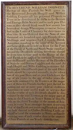 There are three funerary hatchments: two in the north aisle and one over the tower arch, according to English Heritage all 18th-century.[1]