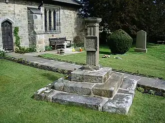In the churchyard, to the south of the church, is a sundial dated 1708. It is in sandstone, and consists of a square base with three steps, supporting a square fluted Doric column with a base and a capital. On the top is a round brass plate with a gnomon. On the side of the sundial is a plaque inscribed with initials and the date. The sundial is listed at Grade II.[4][7] Also listed at Grade II are the walls around the churchyard, and the flight of steps leading up towards the church.[8]