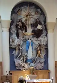 Beyond a south-east porch, the layout of the church is easily read, with nave, aisles and chancel all within three bays. There are no aisle windows, but circular windows appear in the north wall and throughout clerestory. The interior is dominated by the huge, cheerful, brightly painted altarpiece depicting the Coronation of Our Lady carved in wood. It is said, though it is much disputed, that it was shown at the Great Exhibition of 1851 as an example of Tyrolean craftsmanship and was, at one time, destined for Westminster Cathedral.[3]Our Lady is attended by angels in various attitudes in piety and prayer. A golden, winged crown hovers above Her head. The seated figures of Christ and God the Father look on from above and behind Her. The Holy Spirit in the form of a dove sheds rays of light out towards cherubim who are half concealed in the clouds that form the background of the whole tableau. Father Williamson's taste is less evident in other parts of the church. The statue of St. Casimir located to the right of the altar is a piece of fine art made in Lithuania from Ancaster limestone by famous Lithuanian sculptor Antanas Žukauskas in 2009.