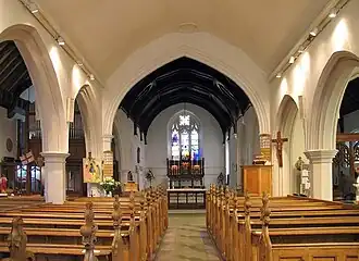 At various times since then, the church has been altered or extended, mostly notably between 1837 and 1840 under the rector, Rev. Robert Eden. In 1872 the chancel was extended eastwards by the architect C. F. Haywood, and the south aisle was added by Ernest Geldart in 1897 as the population of Leigh-on-Sea continued to grow.[3] The lady chapel, designed in 1913 by Sir Charles Nicholson, was added as a memorial to Rt. Rev. Edward King, a former Bishop of Lincoln and uncle of the rector at the time, Rev. Canon Robert Stuart King.[3] King had succeeded his father as rector, and between them they served the parish for over 90 years.