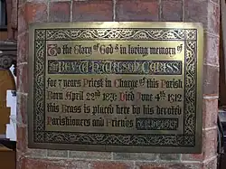 Situated in the North aisle is a private First World War Memorial to Captain Joseph Arthur Brearley and his brother Norman Blackburn Brearley, son's of Harry and Annie Brearley, of 225, Charles Rd., Small Heath, Birmingham. Arthur, after being educated at King Edwards Grammar, Handsworth and Emmanuel College, Cambridge, became a schoolteacher in Exeter and joined the 1/6th Cyclists Battalion of the Devonshire Regiment in April 1914.[32] He became attached the Special Co N Royal Engineers whose role was the firing of gas canisters onto enemy trenches. He was killed on 20 June 1917 during the Battle of Messines Ridge, and the Battalion War diary records, "Gas discharged on Jackdaw and Jam Avenue. Observations from the front line indicates that drums burst well and a good cloud was formed over enemy trenches. Considerable hostile artillery retaliation on front line and C.T.'s. Golden rain,double red and double green lights were used extensively by the enemy. Whole operation including preparation 3 killed 11 wounded." He was 27 and had been with N company just over a month.[33] His brother, Norman Blackburn Brearley was with A company, 9th Battalion Royal Warwickshire Regiment and was killed in action on 19 April 1916. The battalion War Diary records at 0700 whilst attacking a Turkish Trench at Beit aiessa, on the right hand bank of the Tigris. He was seen to be hit during the charge and fell in marshy ground, the water rose and he, and others with him, were drowned before aid could reach them.[34] He was 22 and is commemorated on the Basra Memorial.[35] There is the following inscription on their memorial