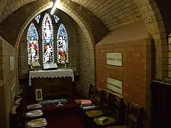 Inside, a set of excellent stained glass windows.[8] being of good-quality, intact and an extensive scheme of stained glass, designed by Hardman & Co.[6] who were also responsible for the stained glass in the Houses of Parliament. Those in the North aisle are illuminated allowing them to be viewed despite them having no natural light being enclosed as a security measure. The restoration was made possible by a donation from a late parishioner and the windows blessed at Easter 2010 with the following words; Almighty and eternal God, we give you thanks and praise for these stained glass images of your saints. For as often as we look on these images with our bodily eyes, As we look at them may we consider the actions of your saints and think about their sanctity for our inmitation. Bless and sanctify these windows made in honour and in memory of your only begotten Son, our Lord Jesus Christ and of these saints. We also remember our faithful servant John Ellison in whose memory these lights were re-installed. May the light of Christ always shine in our hearts. Amen[14]