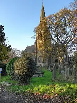 Inside the church is a three-bay arcade carried on octagonal piers. In the chancel are a stone sedilia and piscina.[2] The stained glass in the east and southeast windows is by O'Connor (probably Arthur). At the east end of the north aisle is a window dating from about 1866 by John Adam Heaton. A window in the southwest of the church dating from about 1935 was designed by Edwin Wright, and commemorates the Mothers' Union.[4] The two-manual organ was built in 1972 by Smethurst of Manchester,[5] replacing a three-manual 19th-century organ by Nicholson and Lord that had been rebuilt by Austin Jones of Pendleton in 1925.[6] There is a ring of six bells, all cast in 1887 by John Taylor & Co of Loughborough. There is a further, unused, bell dating from 1835 by Thomas Mears II at the Whitechapel Bell Foundry.[7][8][9]