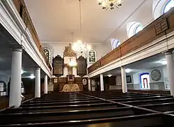 The church retains a set of furnishings, mostly from the 18th century, including a set of box pews and a high central double-decker pulpit and sounding board. The coat-of-arms of King George III (pre-1801) and two carved timber commandment boards in German hang in the church. The Royal Arms were required to be erected in Anglican churches but were adopted by nonconformist congregations voluntarily, as a mark of loyalty. There are donations boards for the church and adjoining former church school and among the donors listed is the King of Prussia.