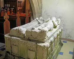 The church is closely linked to the House of Tudor as it is located in the village where the dynasty was founded. Inside the church in the north chapel is the alabaster tomb of Goronwy ap Tudur Hen, the great-uncle of Henry VII of England of the House of Tudor alongside his wife Myfanwy Fychan.[5] His tomb was not originally installed at St Gredifael's Church. However, it was moved there from Llanfaes Friary following the Church of England Dissolution of the Monasteries by his successor Henry VIII of England.[1] The tombs themselves are damaged from vandalism due to pilgrims taking chips off them because of a belief that the tombs materials had healing properties.[1][6] As a result of this, the effigy of Goronwy on the top of his tomb is missing its hands and the effigy on top of Mfanwy's tomb is missing its fingers.[5]
