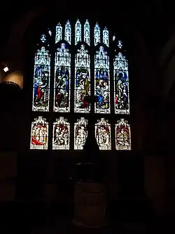 The church spire is a landmark of the town. The earliest parts of the church are late 12th- or early 13th-century. Some of the windows are 14th-century and the building was remodelled in the 15th and 16th centuries.[4] The building was restored in 1869–73 to plans by the Gothic Revival architect Henry Woodyer.[5] Of note within the church are the painted ceiling panels of the north aisle, dating from about 1390 and representing the Tree of Jesse.[6] The church is a Grade I listed building.[7]