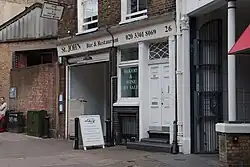St. John is an English restaurant on St John Street in Smithfield, London. It was opened in October 1994 by Trevor Gulliver, Fergus Henderson, and Jon Spiteri on the premises of a former bacon smoke-house.[1] Under Henderson's guidance as head chef, St. John has specialised in "nose to tail eating", with a devotion to offal and other cuts of meat rarely seen in restaurants, often reclaiming traditional British recipes. Typical dishes include pigs' ears, ducks' hearts, trotters, pigs' tails, bone marrow and, when in season, squirrel. As a result, St. John has developed a following amongst gastronomic circles: "chefs, foodies, food writers and cooks on sabbatical".[2][3]