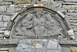 There is a Norman arch over the south doorway: it has two orders, both decorated with chevrons and with alternating sandstone and limestone voussoirs. There is a blocked north doorway, dating from the 12th century, with a carved sandstone tympanum above, now badly weathered. It depicts a seated figure flanked by two kneeling figures, each holding a book. The hood mould around the tympanum is of alternating sandstone and limestone and has animal head-stops.[2][3][4]