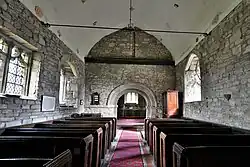 Inside, the wide chancel arch has on the nave side two orders and a decorated hood mould. In the chancel, there is a long stone bench set against the north wall, and one of the windows in the south wall, narrow and round-headed, is Norman. The altar-rails date from the early 17th century. There are monumental inscriptions in the chancel including several for members of the Surman, Cartwright and Bick families in the 17th and 18th centuries.[2][3][4]