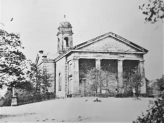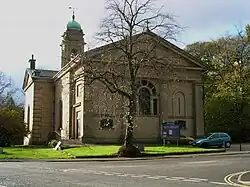 The church on St John's Road was designed in the Neo-Classical Regency style by John White. It was built between 1802 and 1811 through the patronage of William Cavendish, 5th Duke of Devonshire. It is constructed from Ashlar gritstone with a slate roof. In 1896 the architect Sir Authur Blomfield redesigned the nave and the original east portico was enclosed to form the chancel. The large pediment on the facade is supported by undecorated Tuscan-style columns and is inscribed prominently with MDCCCXI. The stained glass windows include several by the Victorian designer Charles Eamer Kempe.[1][2][3]