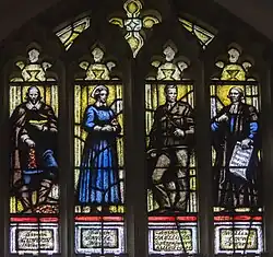 In 1968 a new stained-glass window, designed by Brian Thomas, was installed. It depicts notable people connected to Peterborough: Symon Gunton, vicar of the parish during the plague, between 1665 and 1667 (d.1676), Nurse Edith Cavell (d. 1915), Captain Thomas Mellows (d. 1944, fighting in the French Resistance), and William Law (d. 1761). The window is dedicated to James Ruddle (1830-1898) and to his wife Edith. James Ruddle was a prominent local architect who worked extensively in the Peterborough area and was the son of local carpenter Francis Ruddle.