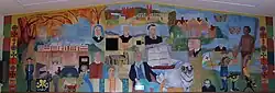 Adjacent to St John's is the church Bishop RG Arthur hall. (He was Rector of St John's in 1953-56.) The hall has a mural painting at its southern end which depicts people and events from the life of the church and the region. Rendered in a simplistic style, the mural depicts subjects as diverse as a theodolite, a microscope, an Aboriginal Australian man, Bogong moths, Merino sheep, liturgical symbols, the Guides Australia logo and a girl in the uniform, a Boy Scout, Old Parliament House, early ministers of the church and settlers. Campbell and his nearby house, "Duntroon", are also depicted; Duntroon is now part of the Royal Military College, Duntroon. The church hall provides a facility for events and meetings and also houses the office of the parish of Canberra.[37]