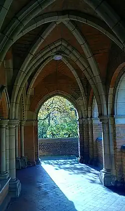 The parish engaged the services of John Loughborough Pearson, an eminent ecclesiastical architect who had already designed a number of churches in the Gothic Revival style which was at the height of fashion in Victorian Britain, including his most recent project in North London, the large-scale St Augustine's, Kilburn which he had completed in 1877.[3] Pearson was to draw up plans for a building to seat 1000 people at Upper Norwood. The Foundation stone was laid on 6 May 1878 in a field, but building work could not commence until enough funds had been raised. The Church Commissioners contributed an additional £1000 on the condition that the building plans included a tower. In 1881, after a total of £7,156, 17 shillings and six-and-a-half pence had been raised, construction began; after six years of construction the building was consecrated on 30 April 1887. Church Commissioners' conditions were never met due to financial difficulty and the church to this day does not have a spire.[2]