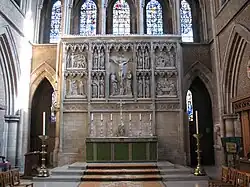 The interior of the building is stock brick with arcades and brick rib vaulting. Most striking is the large stone rood screen across the chancel, which features five gothic arches topped by four statues, and the large carved stone reredos.[5]